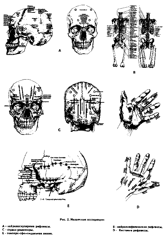 Мышцы оказались наиболее реактивной структурой, которая стереотипно реагирует ослаблением и гипотонией на дисбаланс в какой-либо части системы. Они, как известно из классической неврологии, связаны с определенным сегментом спинного мозга, а через него с другими сегментами и надсегментарными образованиями. В ПКЗ были установлены взаимосвязи между определенными мышцами и отдельными позвонками при их сублюксации, с отдельными или группами позвоночных двигательных сегментов при фиксации, с внутренними органами и железами, зонами нейроваскулярных, нейролимфатических, стопных и кистевых рефлексов, с рефлекторными зонами темпоросфеноидальной линии, стрессрецепторами, акупунктурными меридианами, дефицитом или избыточностью различных химических веществ, т.н. неврологическим зу-бом (Рис.2).