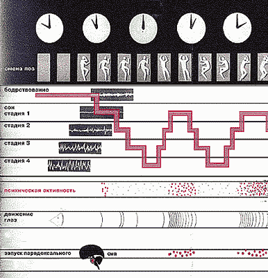 Ночной сон человека. Видно, что в течение ночи проходят четыре цикла сна, причем они неравнозначны: в первую половину ночи преобладает глубокий медленный сон, а в утренние часы - парадоксальный, сопровождаемый сновидениями. Смена поз характерна до и после каждого периода парадоксального сна (выделены цветом), который сопровождается интенсивной психической активностью, движением глаз и активностью нейронов ретикулярной формации ствола.