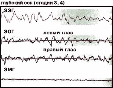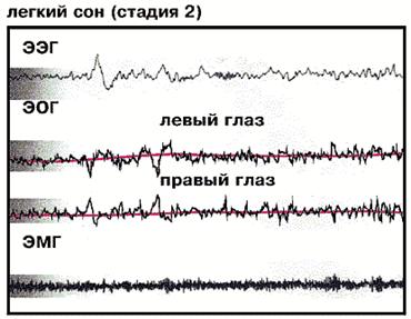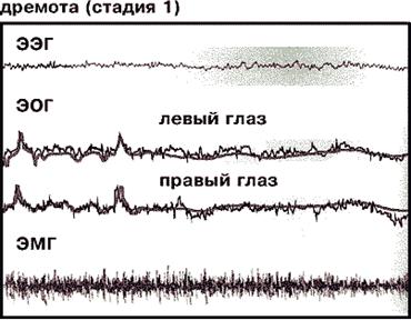 Фрагменты полиграммы на разных стадиях сна. Видно, что для смены стадий медленного сна характерно постепенное увеличение амплитуды и снижение частоты волн ЭЭГ, смена быстрых движений глаз медленными, вплоть до полного исчезновения (ЭОГ регистрируется на фоне ЭЭГ и выделены цветом), прогрессивное уменьшение амплитуды ЭМГ. При парадоксальном сне ЭЭГ такая же, как при бодрствовании, ЭОГ демонстрирует быстрые движения глаз, а ЭМГ почти не регистрируется.