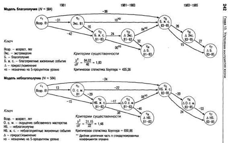 нальный успех), а вот состояние здоровья жен, по преимуществу, связано с «удовлетворенностью своей родительской ролью» (особенно если они занимались воспитанием детей). Попытки установить причинные отношения с помощью каузального моделирования показали, что в данном случае значимы оба направления. Следовательно, субъективное благополучие влияет на состояние здоровья (Ре1з1; ег. а1., 1995).