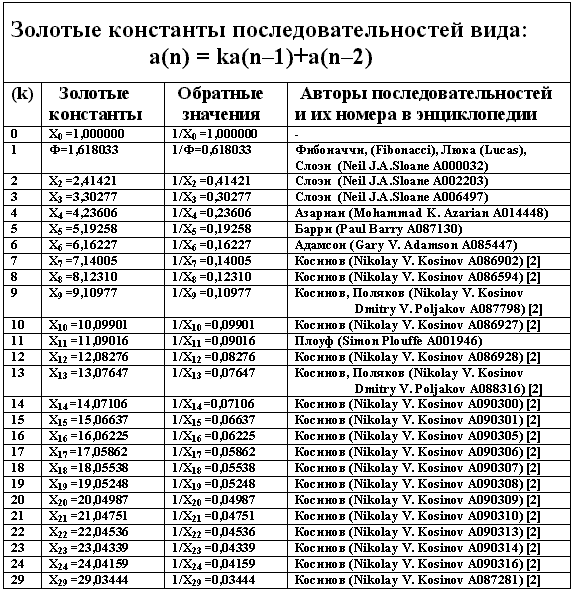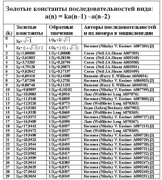 Золотые константы и их обратные значения для последовательностей, члены которых заданы рекуррентными соотношениями a(n)=ka(n–1)+(n–2), приведены в табл.1.