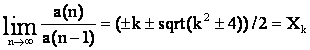 Для последовательностей, члены которых заданы рекуррентным соотношением a(n)=ka(n–1) – a(n–2), общее уравнение: Xk+1/Xk=±k приводит к соотношению: