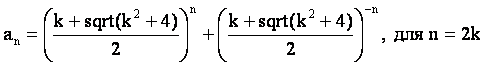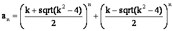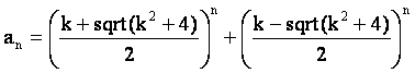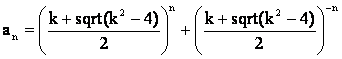 Для последовательностей из семейства a(n)=ka(n–1)+a(n–2) нулевой член главной последовательности: a(0)=((k+sqrt(k^2+4))/2)^0 + ((k-sqrt(k^2+4))/2)^0 = 2. Первый член главной последовательности: a(1)=((k+sqrt(k^2+4))/2)^1+((k-sqrt(k^2+4))/2)^1 = 2k/2=k и т.д.