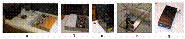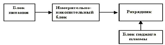 На рис.1а показан общий вид установки, на рис.1б – измерительно-накопительный блок, на рис.1в – блок питания, на рис.1г – разрядник, на рис.1д – блок поджига плазмы.
