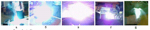 Приведем результаты экспериментальных исследований плазмоидов. На фотографиях (рис.3) видны плазменные образования, имеющие яркое, ослепительное свечение. Эти плазменные образования занимали большой объем пространства над лабораторным столом и накрывали узлы установки. На рис.3.1в и рис.3.1г видна многоцветная структура плазменного образования. Плазмоид имеет слоистую структуру. Видно, что светящаяся зона пурпурного цвета занимает значительно больший объем пространства, чем яркая вспышка в центре.