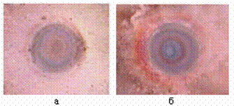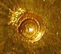 Появление колец вокруг отверстий указывает на особенности внутренней структуры плазмоида. Кольцевая структура наблюдалась как за пределами выгоревшего отверстия, так и в центральной части плазмоида. Кольца в центральной области плазменного конуса хорошо фиксировались на толстостенной медной мишени. На рис.10 показана фотография толстой медной пластинки с углублением, образовавшимся после воздействия плазмоида. В углублении видны характерные кольца. Для надежной фиксации кольцевых структур подбирался уровень энергии разряда, толщина мишеней и расстояние их расположения от зоны плазмообразования. При большой энергии разряда плазма прожигала отверстия в мишени. При уменьшении энергии разряда и при удалении мишени от зоны празмообразования вместо отверстий образовывались углубления в мишени и хорошо фиксировались кольцевые структуры. Наблюдалось увеличение диаметра колец при удалении мишени от зоны празмообразования.