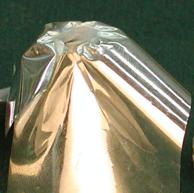 На рис.13 слева показана пленка с напыленным металлом в исходном состоянии. На рис.13 справа показана пленка после воздействия плазмы на металическое напыление. Плоские пленки приобретали характерную конусообразную форму и сохраняли ее после экспериментов. Металл у острия конусов испарялся под действием высокой температуры, а тонкий слой капроновой легкоплавкой пленки во всех экспериментах не выгорал, и принимал конусообразную форму.