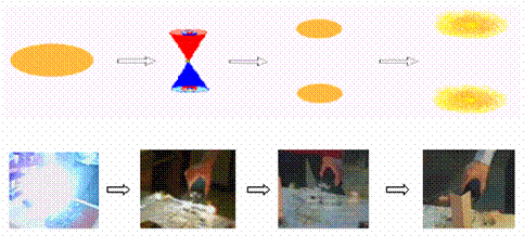 По результатам экспериментов воссоздана картина эволюции плазмоида. Она показана на рис.17 в верхней части рисунка. Последовательность этапов эволюции такая: от одного плазменного образования, к двум симметричным фрактальным системам вложенных конусов, затем к двум плазменным образованиям с хаотическим состоянием плазменного вещества и последующим рассеянием энергии в пространстве. На рис.17 вверху схематически показаны этапы двухэнтропийной динамики плазмоида. На рис.17 внизу показаны соответствующие кадры видеосъемки применительно к каждому этапу.