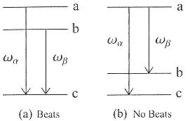 . Квантовые биения - a) Когда единственный атом релаксирует с двух верхних уровней на общий более низкий уровень. Две частоты перехода производят биение в излучаемом фотоне, b) Биения отсутствуют когда более низкие уровни различны. Поэтому конечное состояние атома обеспечивает нас точной информацией о маршруте фотона релаксации.