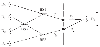 Квантовый стиратель и дополнительностьВ квантовом стирателе [25] информация о пути интерферирующей частицы стирается путем манипуляции второй, спутанной частицей. Дополнительность выполняется не посредством принципа неопределенности (через процесс измерения), но квантовой корреляцией между частицами [26]. Это понятие может реализовываться в контексте двухфотонной интерферометрии [27-29]. Рассмотрим установку, показанную на рисунке 6, где один из двух атомов i = 1, 2 выдает два фотона фi, и γi. Интерференция наблюдается в ф только тогда, когда пространственно источник не может быть различён, то есть, когда срабатывает детектор D1 или D2. Стирание происходит когда фотон отражен (а не пропущен) через лучевые делители BS1 или BS2, что в эксперименте происходит после того, как ф фотон был обнаружен. Таким образом, квантовое переплетение между фотонами допускает реализацию “задержанного выбора” [30], который не может быть смоделирован классической оптикой.