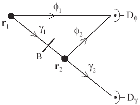 i = 1, 2 фиксированы в позиции и один из них выдает два фотона, помеченных фi, и γi, вызывая двухфотонное состояние, которое является суперпозицией эмиссий каждого атома:|