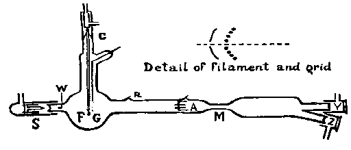 Фиг. 1. Схема первой экспериментальной установки. S - радиоактивный источник; W - окошко с тонким стеклом; F - катод; G - сетка: R - вывод к посеребренной поверхности; А фокусирующие пластины; М - магнитное поле; С - медный контакт; V и Z - сернистоцинковые .экраны. Наверху справа показаны катод и сетка.
