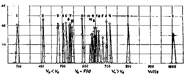 Фиг 2. Интенсивность электронного захвата в зависимости от ускоряющего напряжения; по оси ординат отложен процент захватов, по оси абсцисс - напряжение в вольтах. от 330 до 900 вольт, то можете себе представить, что это за работенка) (Аудитория смеется.) Но они объяснили нам, что поступали не совсем так. В результате предварительных исследований они заметили, что положение пиков определяется скоростями электрона на боровских орбитах, так что они заранее знали, где же искать их. Иногда они находили их не совсем там, где ожидали, но тогда они начинали тщательно исследовать ближайшие значения напряжения, и в результате им удалось обнаружить все пики с исключительно высокой точностью. Настолько высокой, что Дэвис и Барнс были уверены, что они смогут вычислить постоянную Ридберга с большей точностью, чем это удается в результате исследования водородного спектра, то есть с точностью лучшей, чем 10-8. Во всяком случае, они не видели никаких препятствий, ограничивающих точность их метода, особенно принимая во внимание, что они мерили эти самые напряжения с точностью до сотой вольта.