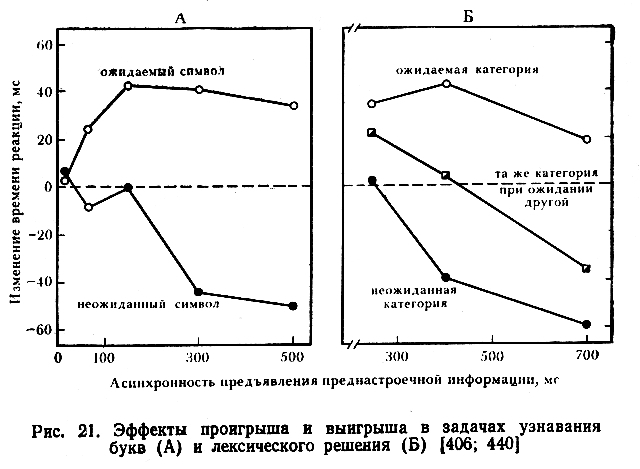 Этот же методический прием был использован в ряде более сложных ситуаций. В задаче сравнения двух букв М. Познер и К. Снайдер [442] меняли задержку между прединструкцией и сравниваемыми буквами. Как показывают результаты, представленные на рис. 21, А, обработка включает здесь как «выигрыш», так и «проигрыш», причем первый нарастает во времени значительно быстрее. Подобная асимметричность микрогенеза свидетельствует о том, что опознание включает очень быстрые автоматические компоненты (примерно 250 мс), за которыми следуют процессы более медленной сознательной обработки.