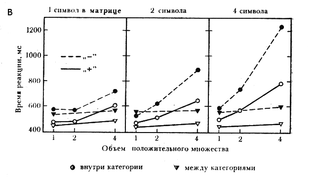 Экспериментальные исследования этих авторов проводились с помощью методики, объединявшей зрительный поиск и поиск в памяти. Испытуемому последовательно с относительно высокой скоростью предъявлялись матрицы, содержавшие от двух до четырех буквенно-цифровых символов (рис. 22,А). Он должен был определить, есть ли среди них хотя бы один символ из показанного ему ранее положительного множества. Критическим различием было использование иррелевантных символов (дистракторов) той же самой или другой категории (условия «внутри категории» и «между категориями» соответственно). Результаты одного из многочисленных вариантов этих экспериментов показаны на рис. 22,Б. При предъявлении стимулов смешанных категорий объем положительного множества и число символов в каждой матрице оказывают незначительное влияние на время поиска — обработка осуществляется в режиме автоматического обнаружения. Напротив, в случае стимулов одной и той же категории эти факторы оказывают выраженное влияние. Наблюдаемый здесь последовательный поиск является к тому же самооканчивающимся (признак произвольного управления), так как наклон отрицательных кривых примерно в два раза больше, чем наклон положительных. Предполагается, что процедуры различения этих простейших категорий фиксированы в нашей долговременной памяти (ср. Г315; 450]). После продолжительной тренировки аналогичные результаты могут быть получены для некоторых еще более условных категорий, например для букв первой и второй половины алфавита [485].