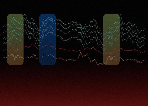Паттерны электрической активности (сверху вниз) задней теменной коры, белого вещества и гиппокампа в высокочастотном ритме при совместной активности гиппокампа (желтым) и без нее (синим)