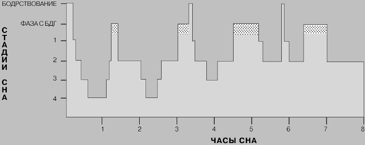 ЦИКЛ СНА У ЗДОРОВОГО МОЛОДОГО ЧЕЛОВЕКА. Как только молодой человек засыпает, появляется начальная 1-я стадия, за которой следуют 2-я, 3-я и 4-я стадии. Затем идет обратный переход от 4-й стадии к 3-й и 2-й, после которых следует фаза с БДГ (область, помеченная точками). По окончании фазы с БДГ вновь появляется 2-я стадия, после которой следуют 3-я, 4-я, 3-я и 2-я стадии и вновь фаза с БДГ. Этот цикл с определенными вариациями повторяется в течение всей ночи. В первые 70 мин сна преобладают 3-я и 4-я стадии (глубокий сон). Первая фаза с БДГ кратковременна, в последующем продолжительность периодов с БДГ, повторяющихся в среднем каждые 90 мин, постепенно увеличивается. Чем ближе к концу ночи, тем меньше времени занимают 3-я и 4-я стадии и больше – фаза с БДГ и 2-я стадия.