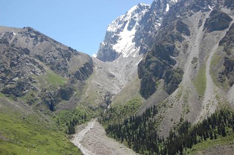 Фото № 30. Селевой очаг в виде селевого вреза на субстрате голоценовой морены (в средней части снимка) Ак-Сайского ледника.