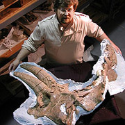 ![]() Майкл Райан держит череп Albertaceratops nesmoi. Это создание отлично вписалось в разветвлённую и длительную эволюцию рогатых динозавров, заняв пустующее место между ранее открытыми видами, жившими до и после него (фото AP). |