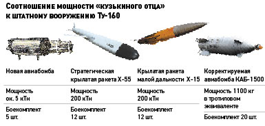 По официальной версии, ее испытания стали ответом России на испытание в 2003 году в США аналогичного по классу устройства — GBU-43/B Massive Ordnance Air Blast Bomb (MOAB). Эта 11-тонная в тротиловом эквиваленте бомба за свою разрушительную мощность была напыщенно названа американцами "Матерью всех бомб". Вот через 4 года Москва и продемонстрировала миру "Отца всех бомб". Российская разработка, несмотря на меньшую массу взрывчатого вещества, мощнее американской в 4 раза, температура в эпицентре взрыва в два раза выше, а по общей площади поражения наша бомба превосходит американскую в 20 раз. "Отцом" планируется вооружить сверхзвуковые стратегические бомбардировщики Ту-160. Эти самолеты раньше несли только крылатые ракеты большой дальности с ядерной боеголовкой. В прошлом году началась их модернизация под применение неатомного оружия, и бомбардировщики получили неядерную крылатую ракету большой дальности Х-555. А теперь и новую бомбу.