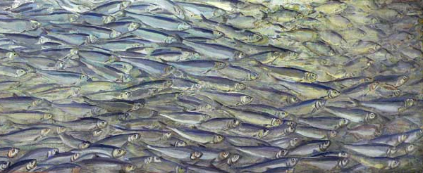 «Ход сельди». Вера Хлебникова, Петр Митурич, 1931 год. Декоративное панно для Рыбного отдела Политехнического музея в Москве (фрагмент). Холст, масло, 150×500. Дом-музей поэта Велимира Хлебникова, Астрахань. Изображение с сайта www.hlebnikov.ru