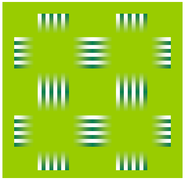 На цветном рисунке на перекрестии полосок возникает «туманный» квадрат, а сами бело-зеленые полоски превращаются в объемные цилиндрики.