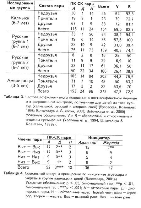 Индивидуальные интервью, с русскими и калмыцкими детьми позволили выявить их установки относительно правил поведения после конфликта (Таблица 6). Было показано, что дети к 7 годам имеют уже достаточно четкие представления о том, как следует себя вести после конфликта с другими, в зависимости от степени близости отношений с конкретным партнером. Их представления четко следуют нормам поведения, принятым в данной культуре. Это касается вопросов о том, кто должен мириться первым (агрессор). Ответ соответствует результатам этологических наблюдений. Дети отмечают, что с друзьями мириться легче. Если вспомним, выше мы говорили о том, что в рамках представлений о "дозволенности" агрессивных взаимодействий с конкретным партнером ожидается, что конфликты будут происходить чаще с теми, с кем легче мириться в дальнейшем. И именно с друзьями дети чаще конфликтовали по это-логическим наблюдениям. Дети также говорили, что при примирении с друзьями следует применять более интимные и выразительные способы интеграции (подарки, поцелуи), тогда как при примирении с нейтральными лицами формальных извинений бывает достаточно. Определенные правила поведения третьих лиц так же присутствуют в поведении 6-7 летних школьников: нужно защищать жертву, защищать друга против более сильных детей. Дети также верят, что друзья всегда заступятся за них и придут на помощь (реципрокный альтруизм в действии). Действительно, если вспомнить этологичес-кие данные, друзья часто приходят на помощь. Однако, мальчики помогают нападающему, а девочки, чаще помогают жертве.