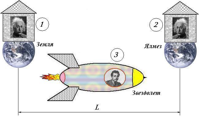 Сформулируем условия эксперимента в полушутливой форме. Предположим, что две планеты – Земля и Ялмез, являющаяся колонией Земли и расположенная в далекой галактике, образуют инерциальную систему отсчета. В некоторый момент времени мимо Земли в сторону планеты Ялмез направляется звездолёт, летящий с субсветовой скоростью. Когда звездолёт оказывается рядом с Землёй, происходит удивительное событие: рождаются близнецы-тройняшки. Один из них родился на Земле, другой – на планете Ялмез, а третий – на звездолёте. Не требуется никакой синхронизации часов, скрупулёзного учёта относительностей одновременности и других хитростей СТО, чтобы понять: в момент рождения два из близнецов находились в одной точке пространства (условно, разумеется), поэтому они – ровесники. При этом, как видим, нет никаких нарушений инерциальности: обе системы – ИСО звездолёта и ИСО Земля-Ялмез без всяких оговорок – инерциальные. Поэтому мы ожидаем интересные выводы о возрасте близнецов, для чего лишь необходимо решить вопрос: каким образом сравнить их возрасты по прилёту третьего близнеца на планету Ялмез. Предположим, что скорость звездолёта была такой, при которой замедление темпа времени движущихся часов равно двум. Это приблизительно 0,86с километров в секунду. Примем расстояние между Землёй и Ялмез в ИСО этих планет таковым, что звездолёт одолеет его за 40 лет, то есть L=32,4c километров. По прошествии 40 лет по земному времени близнец, родившийся на звездолете, прибывает на планету Ялмез. Звездолёт летим мимо, но между близнецом 2 и близнецом 3 в одно короткое мгновение происходит диалог.
