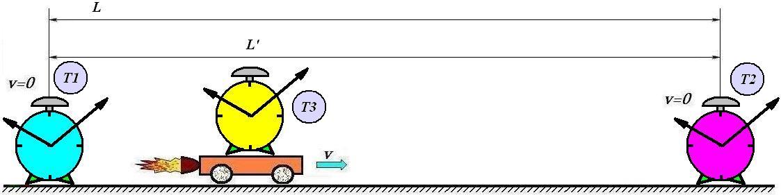 Аналогично делаем вывод: в неподвижной ИСО длина платформы видится укороченной до величины L`, против исходной длины L. Выше мы пришли к выводу, что уменьшение времени должно быть в точности равно сокращению платформы, то есть: