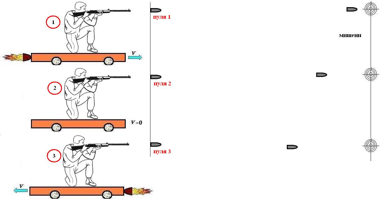 Согласно существовавшей на тот момент теории неподвижного эфира, можно было измерить абсолютное движение Земли по отношению к эфиру. Проведём такую аналогию. Три стрелка метятся в мишень (рис.5). Первый стрелок находится на платформе, которая приближается к мишени. Второй неподвижен. Третий находится на платформе, которая удаляется от мишени. В тот момент, когда все три стрелка поравнялись, они выстрелили. Первой достигнет мишени пуля, выпущенная первым стрелком; затем мишени достигнет пуля второго стрелка; последней в мишень попадет пуля третьего стрелка. Разница во времени попадания пуль в мишени зависит от скорости платформ. То есть, измеряя задержку попадания пули в мишень, мы можем оценить скорость движения платформы (аналога Земли):