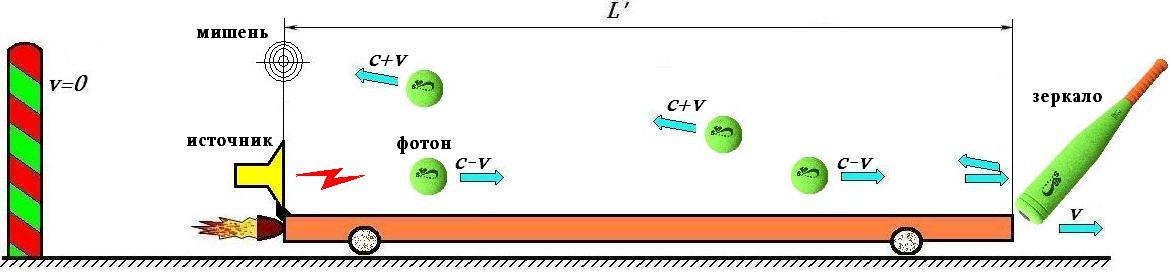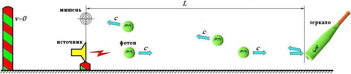 По аналогии со стрелками появилась идея определить абсолютную скорость Земли. Но оказалось, что с фотоном ситуация иная. Если стрелки выпустят в мишень световые лучи, то все они достигнут мишени одновременно, независимо от скоростей платформ. Не смотря на то, что ИСО приобрела скорость, скорость фотона осталась прежней и по-прежнему t = L/c. Это довольно странно, поэтому проанализируем процесс. Не вдаваясь в технические детали опыта и установки Майкельсона, рассмотрим физическую сущность опыта, используя методику Майкельсона. Для этого возьмем платформу длиной L, которую пересекает фотон, испущенный неизвестным источником и просто пролетающий мимо. Фотон для наблюдателей на платформе пролетит через неё за время t = L/c. Затем разгоним платформу до скорости v и вновь замерим время пролёта фотона. Время окажется с точности таким же. Но почему? Платформа разогнана, а фотон, как ни в чём ни бывало, преодолевает её за то же самое время. Проведём мысленный опыт на установке, подобной установке Майкельсона и изображенной на рис.6. Изобразим фотон бейсбольным мячом, а зеркало – битой, которая отражает фотон-мяч от противоположной стенки и возвращает его к мишени. Если наблюдателю ничего не известно о движении своей системы отсчета, он считает её покоящейся и вычисляет, что фотон преодолеет платформу за время t = 2L/c (путь туда и путь обратно).