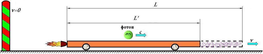 Теперь мы разгоняем платформу до скорости v. О том, что скорость платформы увеличивается, мы можем объективно судить по ускорению. По формулам Ньютона и длительности воздействия ускоряющей силы мы можем сделать оценку скорости движения платформы. Точное значение этой скорости нас не интересует, но мы можем её измерить по скорости удаления оставленного за пределами платформы маяка. Проводим повторно опыт с пролетом фотона через платформу. Время этого пролета по-прежнему равно L/c. Но фотон ничем не связан с платформой, поэтому следовало ожидать, что время его полёта должно возрасти: