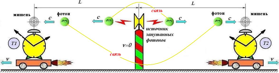 При обсуждении явления запутанности частиц в квантовой механике и мгновенности коллапса волновой функции всегда подчеркивается отсутствие противоречия между квантовой механикой и специальной теорией относительности. Однако явление запутанности, тем не менее, позволяет в принципе организовать проведение эксперимента, который явным образом может показать, что движущиеся друг относительно друга часы идут синхронно (рис.9). Это означает, что утверждение СТО о том, что движущиеся часы отстают, - ошибочно [2]. Есть веские основания полагать, что между квантовой теорией и специальной теорией относительности существует неустранимое противоречие, касающееся скорости передачи взаимодействия и квантовой нелокальности. Положение квантовой теории о мгновенности коллапса вектора состояния противоречит постулату СТО об ограниченности скорости передачи взаимодействия, поскольку существует способ использовать коллапс для формирования сигнала синхронизации, являющегося фактически информационным сигналом, мгновенно распространяющимся в пространстве. Отсюда следует вывод, что одна из теорий – квантовая или специальная теория относительности, либо обе теории требуют пересмотра в вопросе о скорости передачи взаимодействия. Для квантовой теории – это отказа от квантовой корреляции запутанных частиц (нелокальности) с мгновенностью коллапса волновой функции на любом расстоянии, для СТО – это предельность скорости передачи взаимодействия.