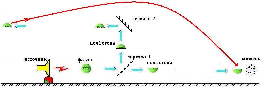 Явление интерференции также свидетельствует о сверхсветовой способности «схлопывания» фотона в точке взаимодействия. При прохождении фотона через полупрозрачное зеркало (расщепитель) он как бы оказывается одновременно в двух разделённых точках пространства (рис.11), которые могут быть на довольно большом расстоянии друг от друга. Фотон может быть зафиксирован (зарегистрирован, измерен) в каждом из каналов, что позволяет предположить, что он действительно разделятся на две половинки [1]. Однако эти две половинки обладают уникальным свойством: они схлопываются одна в другую и только одна в другую.