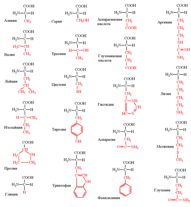 Рис. 1. Структуры канонических аминокислот. Аминокислоты имеют константные части, обозначенные на рисунке чёрным цветом, и вариабельные (или радикалы), обозначенные красным.
