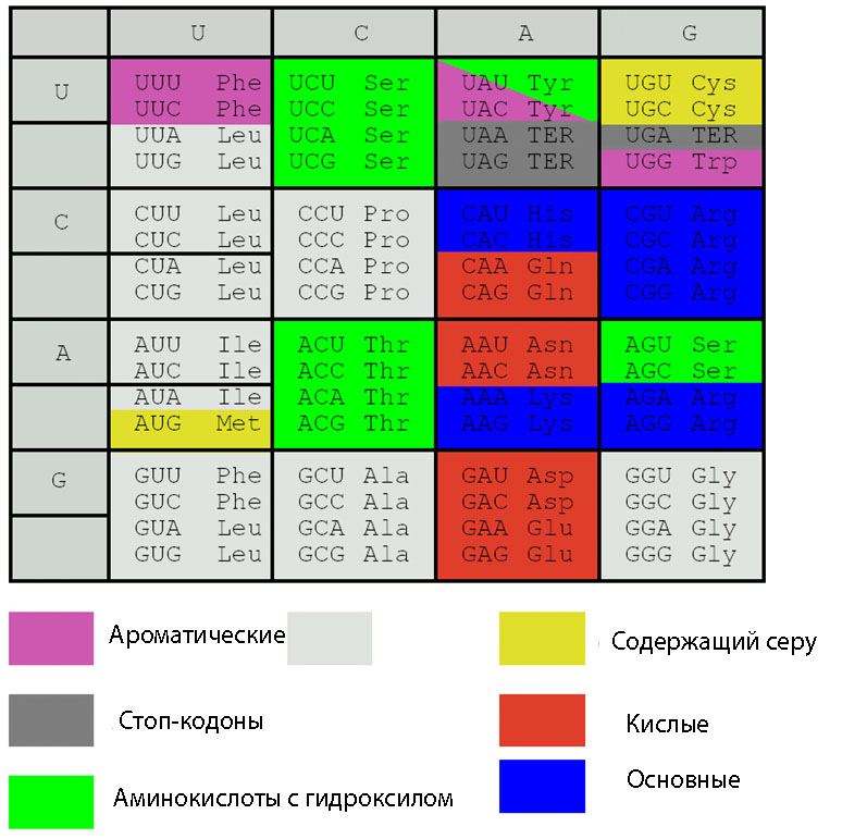 2) Соответствие аминокислот кодонам не всегда является однозначным. О нарушении случаев однозначности см. ниже.