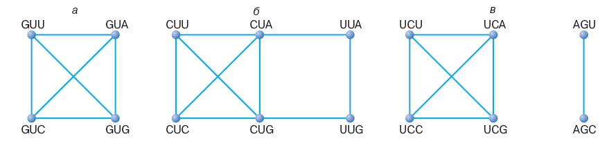 Рис. 5. Графы связности для некоторых кодовых серий. а - связная серия валина; б - связная серия лейцина; серия серина несвязная, распадается на две связных подсерии. Рисунок взят из статьи В.А. Ратнера "".