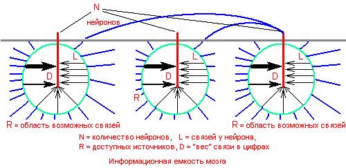 Каждый из N нейронов посредством каждого из своих L входов – дендритов (через один или через несколько входов) может быть связан с некоторыми L нейронами из числа R близлежащих нейронов, (в том числе, и с самим собой). Пусть каждый нейрон может связаться через один из своих входов (длиной 1 мм) с одним из своих соседей – нейронов, находящихся в пределах досягаемости для дендритов данного нейрона, то есть, расположенных внутри сферы с радиусом, равным длине дендрита r = 1 мм. Объем этой сферы V = (4п/3) * r3 ≈ 4.2 мм3 , и в объеме этой сферы находится в среднем около 42 000 нейронов. Тогда как все 15*109 нейронов мозга располагаются приблизительно в 1.5 * 106 мм3 (= 1500 см3 ) объема всего мозга. Так что в пределах досягаемости дендритов рассматриваемого нейрона расположено около 42 000 нейронов-соседей (самих ядер – сом нейронов). Но дендриты контактируют с аксонами, простирающимися на сотни мм от своего ядра. Так что можно смело сказать, что нейрон через каждый из своих входов может связаться более, чем с 80 000 других нейронов. То есть, R > 80 000.