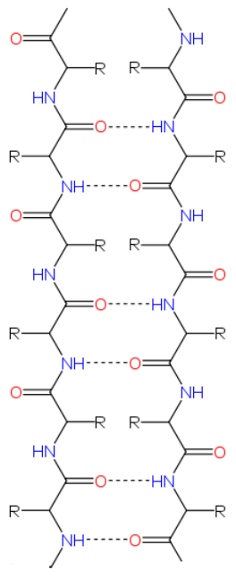 Рис. 4. Структура укладки белка типа бета-лист с образованием водородных связей между аминогруппой и кислородом карбоксильной группы. Символом R обозначена боковая группа любой аминокислоты. Взято из соответствующей статьи в Википедии.