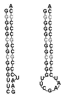Как можно интерпретировать полученный результат? Один из возможных вариантов состоит в том, что исходно на олигомер длиной порядка дюжины но, состоящий в основном из цитидин-фосфатов, налипли комплиментарные нуклеотиды, и получилась короткая двойная спираль РНК с единственным дефектом (неспаренным нуклеотидом U, см. левую часть рис. 3). Из-за указанного дефекта, а так же преобладания на одном из её концов пар A-U, скрепляемых не тремя, а лишь двумя водородными связями, "слабый" участок олигомера в какой-то момент частично расплёлся, и "концевые" нуклеотиды соединились между собой. В итоге получилась классическая структура типа "шпилька" со стеблем, состоящим исключительно из пар C-G, и петлёй, состоящей преимущественно из нуклеотидов U и А (см. правую часть рис. 3). При этом, крайная пара нуклеотидов стебля G-C, вплотную примыкающая к петле, оказывается "слабым звеном" всей конструкции, так как указанные нуклеотиды вследствие существования хаотичных тепловых флуктуаций местоположения их неспаренных соседей по нуклеотидной цепочке цепочке непрерывно подвергаются дополнительным усилиям на разрыв водородных связей. В результате, при определённых условиях (скажем, повышении температуры) цепочки стебля могли начать постепенно расходиться по направлению снизу-вверх.
