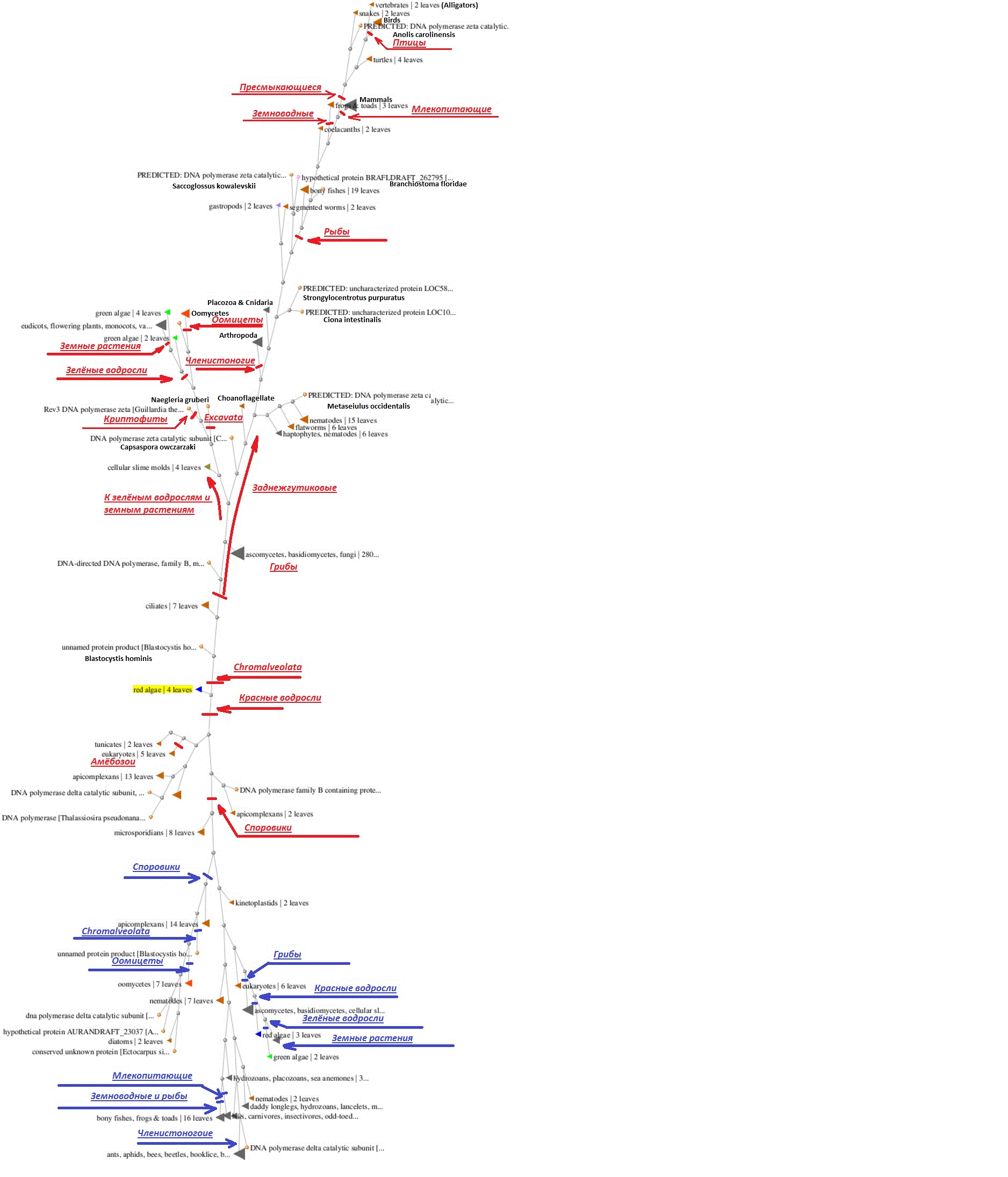 Для целей предстоящего исследования выберем семейство ДНК-полимераз эукариот – альфа, дельта и дзета. Эти полимеразы есть у большинства эукариот – альфа отвечает за первоначальный этап удлинения праймера, дельта как правило является основной ДНК-полимеразой, а дзета служит для полимеризации проблемных (повреждённых) участков исходной ДНК. При этом, считается наиболее вероятным, что все они произошли в результате дубликации предковой архейной ДНК-полимеразы семейства B (можно отметить, что дублирование какого-нибудь гена с достаточно широким спектром функций с последующей специализацией каждой копии на более узкой задаче, это вообще "фирменный" метод эволюции эукариот). Это даёт нам шанс попытаться локализовать корень дерева эукариот, так как исходно указанные три гена должны были исходно обладать очень высокой степенью гомологии между собой, и лишь постепенно в процессе эволюции они дивергировали от точки «Большого Взрыва», коим я называю факт появления на эволюционной сцене эукариот. В качестве отправной точки можно выбрать ген дзета полимеразы многоклеточной красной водоросли Chondrus crispus, так как, насколько известно автору, отпечатки в породах возрастом 1.2 млрд. лет другой многоклеточной красной водоросли (Bangiomorpha) являются древнейшими из следов эукариот, по интерпретации которых у учёных ещё наблюдается единодушие. Результаты работы Бласта (это общедоступная система поиска гомологичных генов и построения соответствующих графов, отражающих степень их родства) по построению филогенетического дерева одной тысячи генов, наиболее похожих на исходный, приведены ниже.