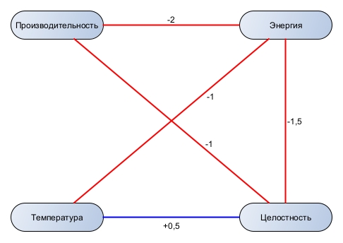 Рис.4. Сеть динамической модуляции между параметрами самоподдержания. Стрелки показывают направление влияния, цвет — тип (красный: потребление, синий: прирост), цифры — величина сдвига Δij.