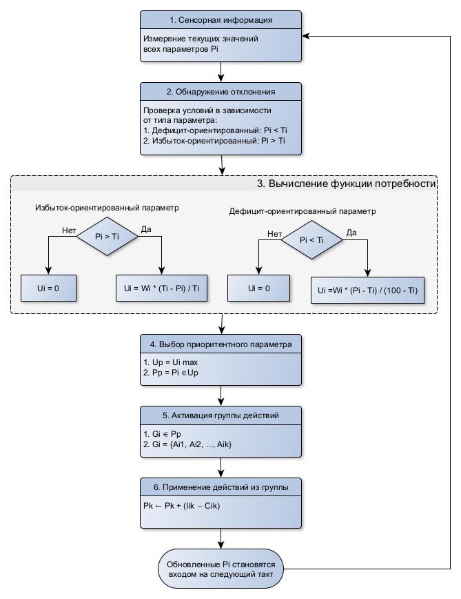 Каждый параметр Pi представляет из себя элементарный базовый регулятор и моделирует критически важный аспект функциональной целостности агента (например, энергия, целостность, температура).
