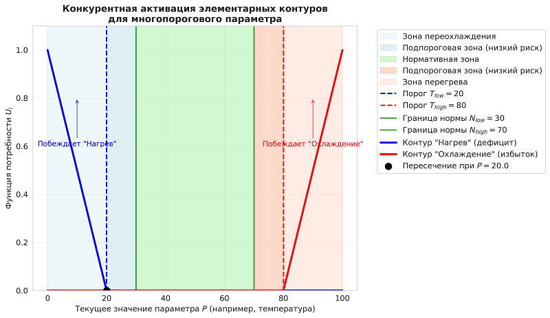 Рис.3. Конкурентная активация двух элементарных контуров параметра «Температура»: «Нагрев» (при P < 20) и «Охлаждение» (при P > 80). На каждом такте побеждает контур с максимальной функцией потребности Ui. Точка пересечения кривых показывает переход приоритета. Нормативная зона выделена зелёным.
