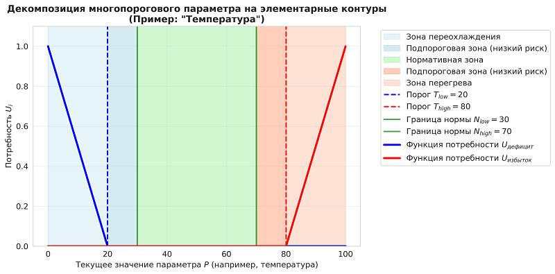 Рис.2. Декомпозиция многопорогового параметра «Температура» на два элементарных контура: дефицит-ориентированный (активируется при низких значениях) и избыток-ориентированный (активируется при высоких значениях). Нормативная зона выделена зелёным. Функции потребности активируются только за пределами соответствующих порогов и нормализованы к [0,1].