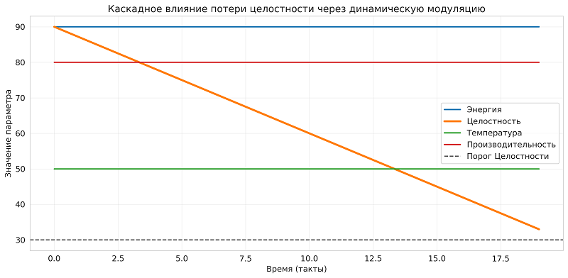 Рис.5. Каскадное влияние нарушения "Целостности" на другие параметры через механизм динамической модуляции. Без учёта этих связей агент может недооценивать последствия своих действий.