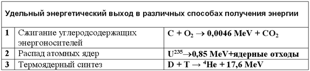 Основные современные способы получения энергии основаны на химических или ядерных реакциях. В таблице1 для сравнения приведены приближенные значения удельного энергетического выхода для различных способов получения энергии.