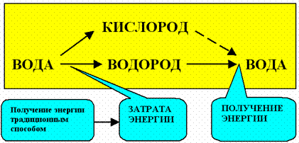 Решение проблемы экологической безопасности видят в использовании водорода в качестве энергоносителя. Водород привлекателен тем, что при его сжигании образуется вода – совершенно безопасное вещество. Считается, что по экологической безопасности у водорода нет конкурентов. Однако реализация этой задачи сдерживается большими энергозатратами на получение водорода из воды. Если нефть, газ и уголь - это готовые энергоносители, то водород в чистом виде на Земле отсутствует. Чтобы получить водород его необходимо добыть из воды, на что затрачивается электроэнергия, ранее полученная путем сжигания все тех же традиционных энергоносителей. Поэтому, экологически чистому использованию водорода все равно предшествует экологически опасный способ получения энергии для разложения воды. На рис.1 приведена схема энергопреобразований при получении и сжигании водорода.