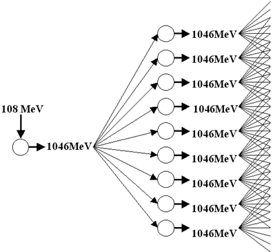 Как отмечалось выше, доля энергии, обеспечивающая устойчивость протона, составляет величину около 11,5 % от его энергии покоя. Расчеты показывают, что энергии одного протона достаточно для того, чтобы при распаде инициировать распад еще 8 протонов. При соответствующих условиях возможна цепная реакция индуцированного распада протонов, которая может поддерживаться и развиваться за счет деструктуризации вещества. При этом будет происходить генерация зарядово-сопряженных частиц, имеющих массу меньше, чем у протона. Необходимым условием, при котором возникает цепная реакция распада протонов, является получение ими дополнительной энергии не менее 107,74 МэВ на один протон. Все промежуточные зарядово-сопряженные частицы неустойчивы. При достаточном количестве зарядово-сопряженных пар суммарная энергия их рекомбинации может превысить энергию 107,74 МэВ, что является достаточным для инициирования распада другого протона. При этом возможна самоподдерживающаяся цепная реакция индуцированного распада протонов. На рис.6 приведена схема цепной реакции индуцированного распада протонов.