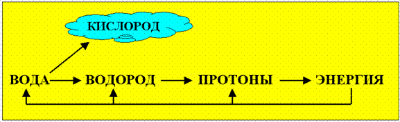 Такие беспрецедентные возможности нового энергоносителя позволяют выдвинуть новую энергетическую концепцию, в которой вода выступает в качестве заменителя традиционных энергоносителей. Новый способ получения энергии основан на индуцированном распаде протонов водорода, содержащихся в воде. На рис.9 показана схема способа получения энергии из воды, основанном на индуцированном распаде протонов водорода.